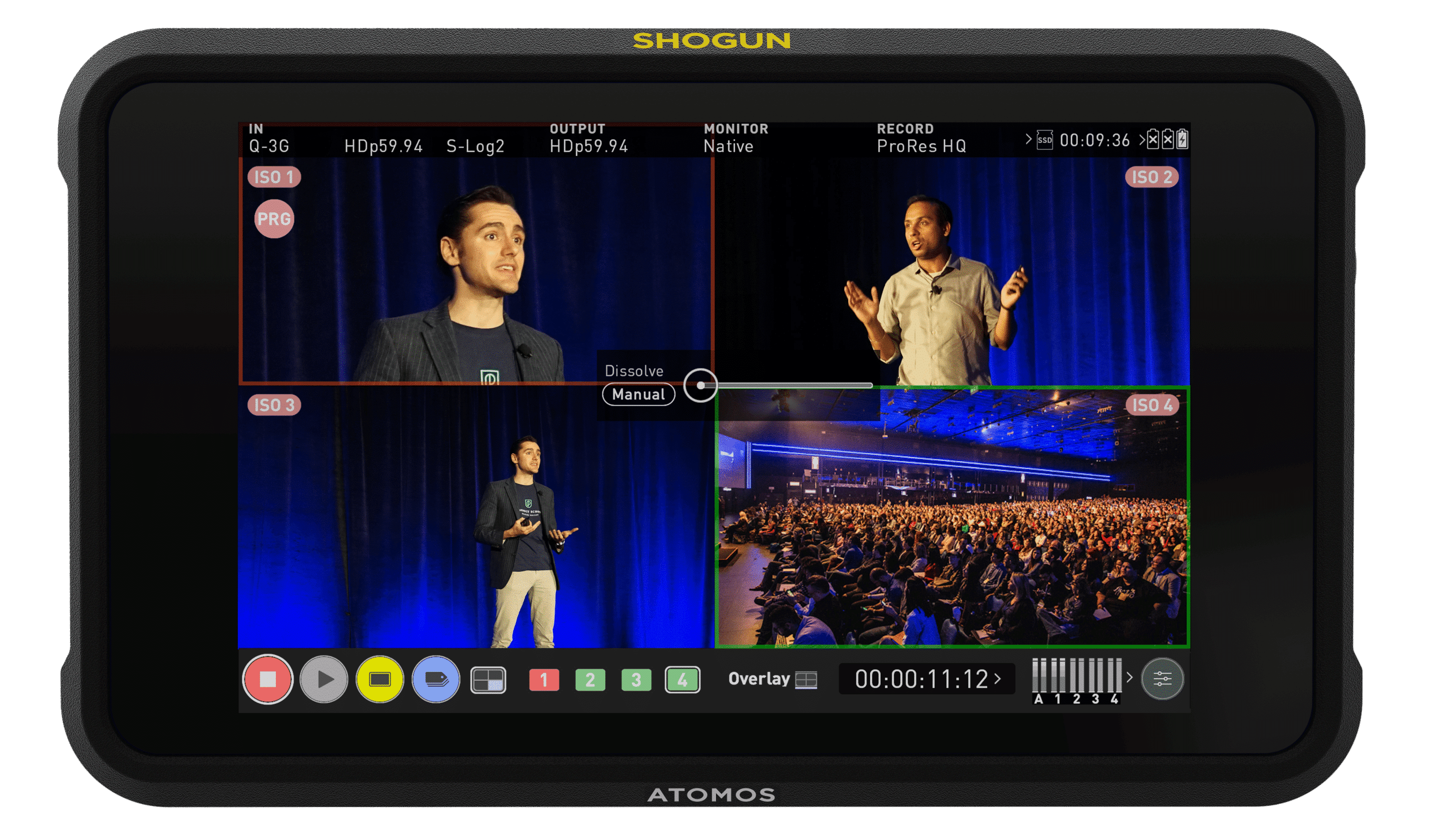 Take full advantage of 4 x SDI inputs and let Shogun Classic step into the role of a portable, quadview live switcher and recorder on your multi-camera shoots. Record up to four 1080p60 streams simultaneously as separate ISOs while cueing and switching in real-time with a simple touch of the screen.